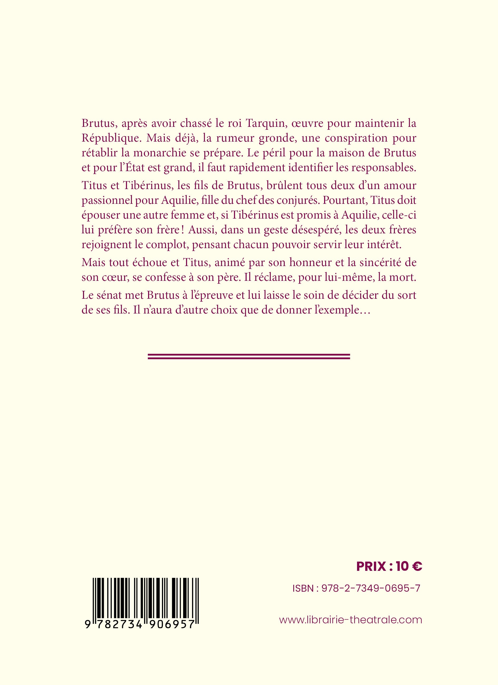 Brutus, après avoir chassé le roi Tarquin, œuvre pour maintenir la République. Mais déjà, la rumeur gronde, une conspiration pour rétablir la monarchie se prépare. Le péril pour la maison de Brutus et pour l’État est grand, il faut rapidement identifier les responsables. Titus et Tibérinus, les fils de Brutus, brûlent tous deux d’un amour passionnel pour Aquilie, fille du chef des conjurés. Pourtant, Titus doit épouser une autre femme et, si Tibérinus est promis à Aquilie, celle-ci lui préfère son frère! Aussi, dans un geste désespéré, les deux frères rejoignent le complot, pensant chacun pouvoir servir leur intérêt. Mais tout échoue et Titus, animé par son honneur et la sincérité de son cœur, se confesse à son père. Il réclame, pour lui-même, la mort. Le sénat met Brutus à l’épreuve et lui laisse le soin de décider du sort de ses fils. Il n’aura d’autre choix que de donner l’exemple…